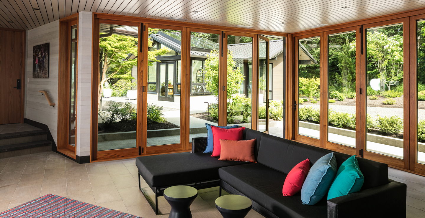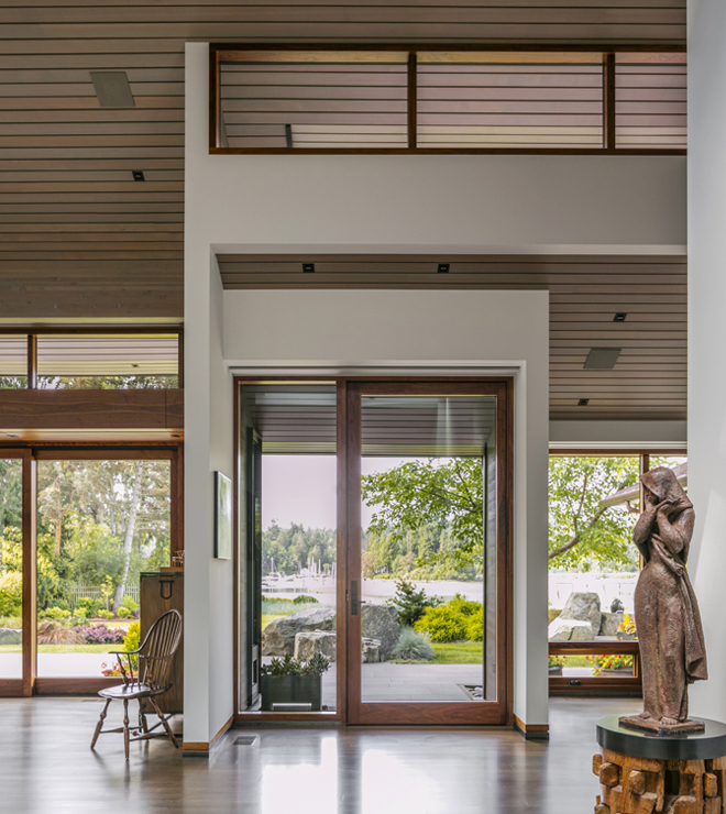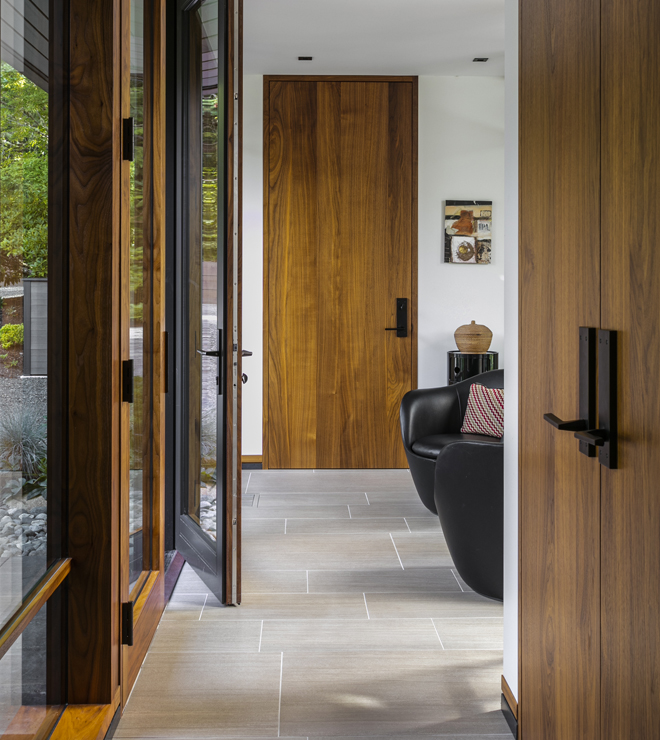 This whole-house remodel required gutting the former space and rebuilding from the wall plates up. The completed dwelling—including a guest house and indoor pool—features black walnut window and door frames, and waxed steel accents throughout.
